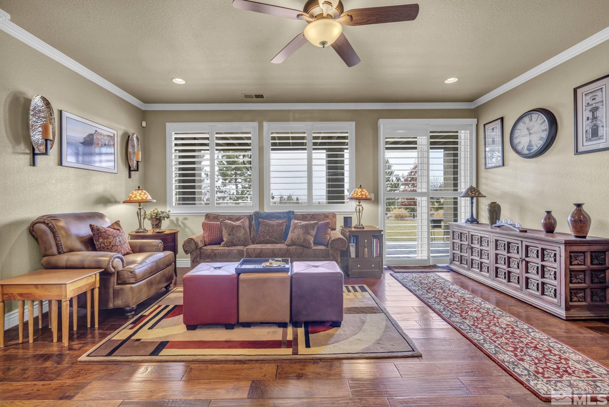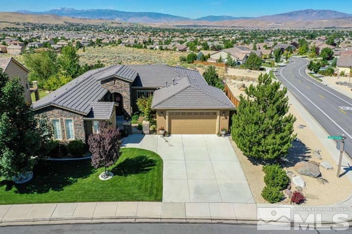 VIEWS VIEWS VIEWS!!!! Stunning Sparks Home with Spectacular Views & Luxurious Upgrades Welcome to 3840 Desert Fox Dr, a breathtaking home in Sparks, NV, offering 4 bedrooms, 3 bathrooms, an office/den, and a theater or entertainment room, with the primary bedroom on the main floor, perfect for modern living. Nestled against a serene Greenbelt with no future development behind, this home boasts unparalleled views of the mountains and valley., Inside, you will find high-end upgrades and impeccable design, including Roman shades, plantation shutters, walnut-engineered floors, and travertine tile. The open-concept kitchen features updated high-end appliances, custom cabinets, under-cabinet lighting, and marble countertops in the primary bath. A media room with a built-in wet bar and surround sound speakers makes for the ultimate entertainment space. The daylight walk-out basement extends the home's functionality, while the freshly painted exterior, updated fencing and gates, and new exterior lighting add to its curb appeal. Outside, enjoy a pristine, fully re-landscaped yard with new sod, automatic drip sprinkler system, paver walkways, a built-in storage shed, and a stunning fountain in the front yard. The expansive patio and deck create a spectacular outdoor entertaining space, all set against a peaceful, natural backdrop with stairs that lead to the back yard for easy access. Additional features include Nest thermostats, a security system, and Customs Cherry Cabinet entertainment system. This home is a rare gem offering both luxury and tranquility. Don't miss the opportunity to make it yours! Schedule a showing today.